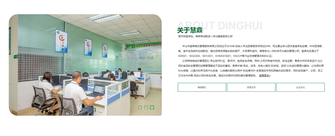中山市慧鼎餐饮管理服务有限公司成立于2018年,创始人专注团餐服务领域近20年。现主要业务以团体食堂承包经营、中央厨房配餐、食材全品类供应链配送、餐饮品牌资源整合自助餐厅、水吧便利超市、等服务为一体的多元化餐饮管理公司