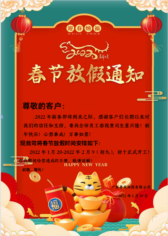 放假时间:2022年01月20日至2022年02月09日,初十(02月10日)正式开工。给您带来的诸多不便,敬请谅解!