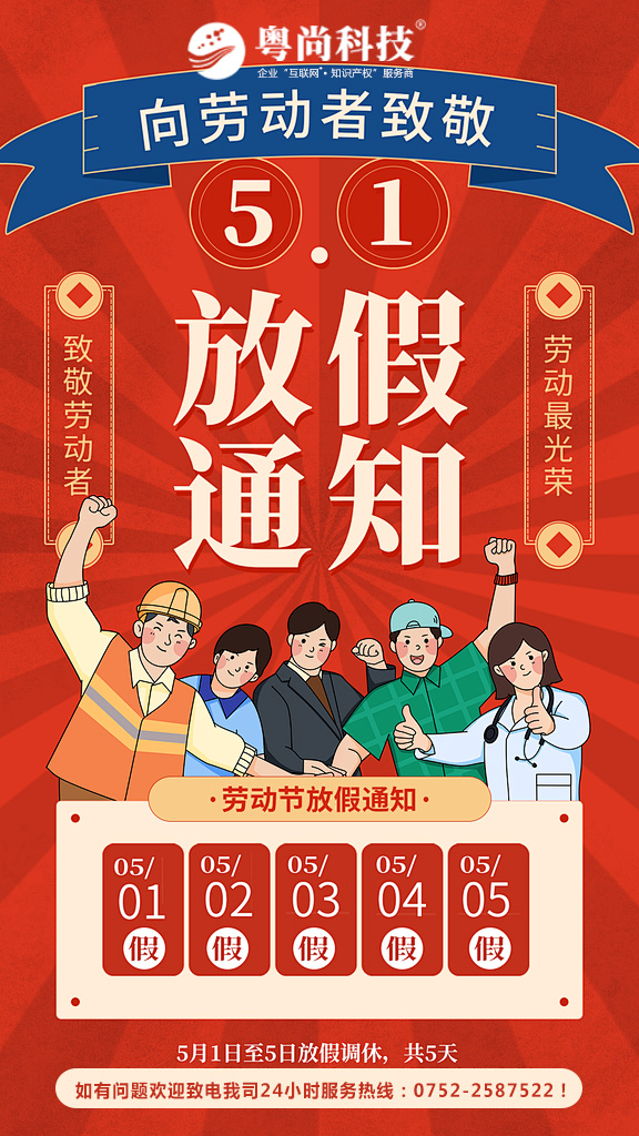 五一劳动节日到,我要送新老客户五个一:一个好心情,一个好身体,一个好,奖金多多再翻一倍,事业发达再进一步,人气直升再火一点,身体安康再棒一点,业绩是帆,工作是船,工作需要多一点激情,生活需要多一点快乐,爱情需要多一点甜蜜,友情需要多一点联系,祝朋友们工作顺心如意,事业蒸蒸日上,粤尚科技全体同仁祝新老客户及全体同仁五一劳动节快乐!