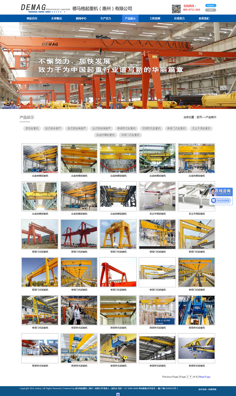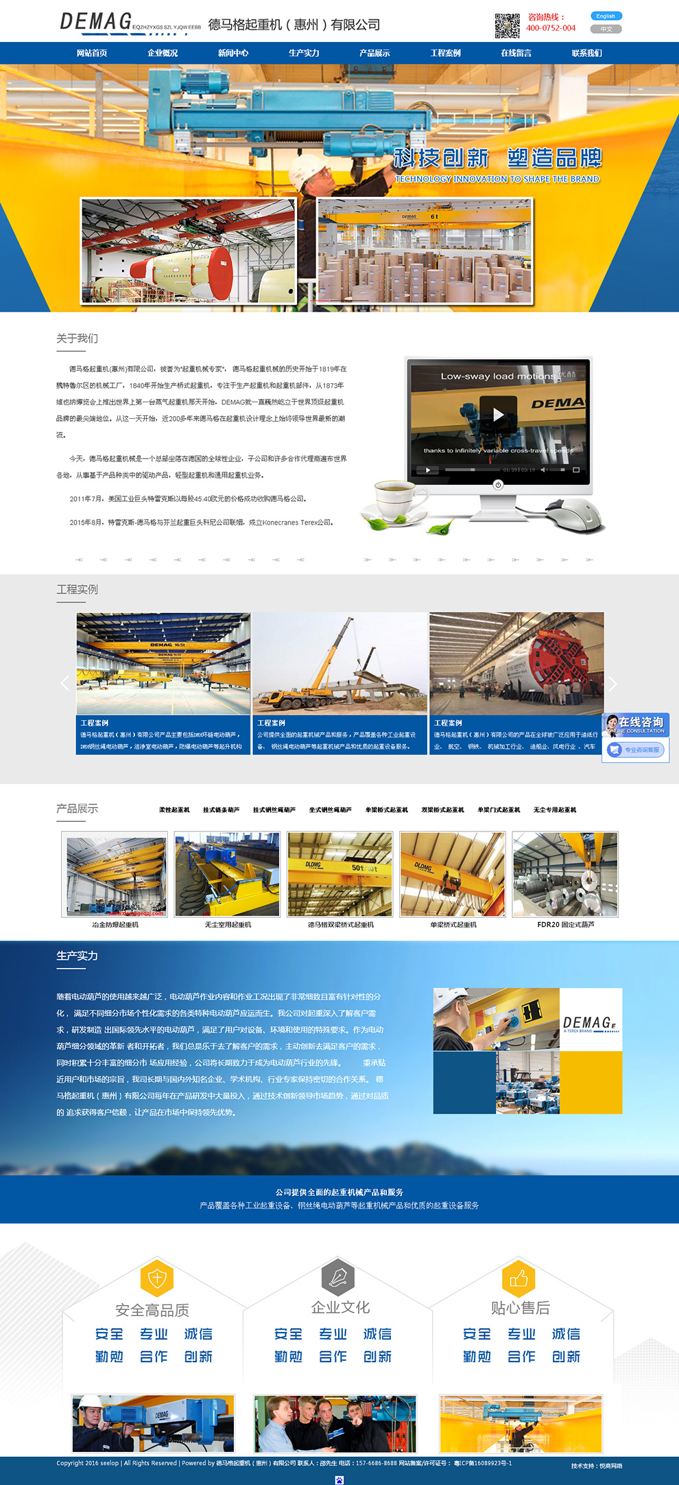 惠州三合一网站建设案例--德马格起重机(惠州)有限公司作为专业的电动葫芦制造商和起重机设备及服务的 供应商,德马格起重机(惠州)有限公司勇于创新,追求技术进步,精益求精,致力于 为客户提供专业的更安全、更经济的起重机解决方案,并依托我们的技术中心和研发中 心,为客户提供个性化的物流搬运解决方案